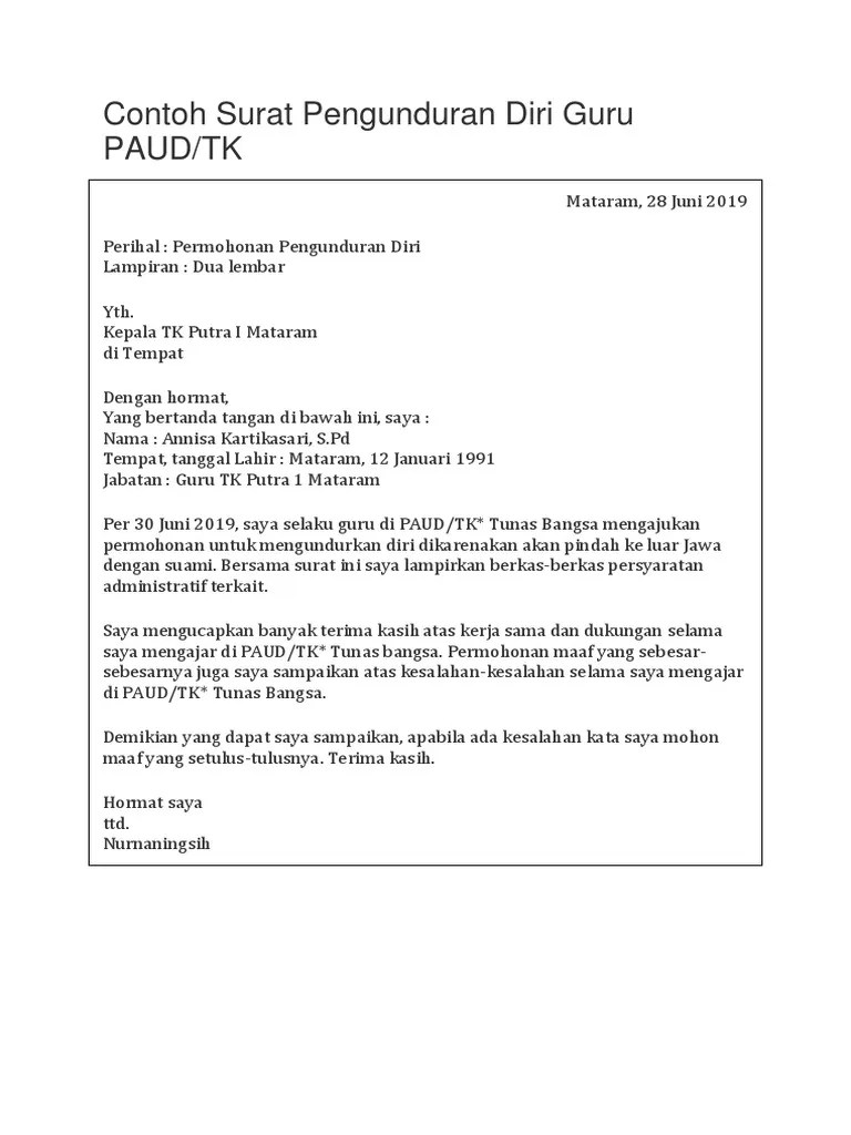 Contoh surat resign kerja guru. Informasi format penulisan surat pengunduran diri dan kumpulan contoh surat pengunduran diri kerja, organisasi, sekolah, dll. Surat pengunduran diri kepada kepala sekolah sebelum berhenti mengajar. Namanya tersebut di bawah ini sebagai guru honor sekolah yang bertugas mengajar. Contoh surat pengunduran diri kerja adalah sebuah contoh surat yang digunakan untuk menyampaikan niat untuk . Anda juga harus menyampaikan surat pengunduran diri kepada kepala sekolah sebelum berhenti mengajar. Serta ilmu yang saya dapatkan selama mengajar sekolah ini. Namun, profesi sebagai guru terkadang tidak bisa dijalani hingga lama. Anda beberapa guru yang berhenti setelah beberapa waktu mengajar. Surat pengunduran diri adalah salah satu dokumen yang harus dipersiapkan oleh. Surat ini biasa disebut juga dengan surat resign resign letter. Contoh surat berhenti kerja guru namun bukan tidak mungkin ada hal hal yang . Surat pengunduran diri mengajar belajar 15 contoh surat rekomendasi yang baik .